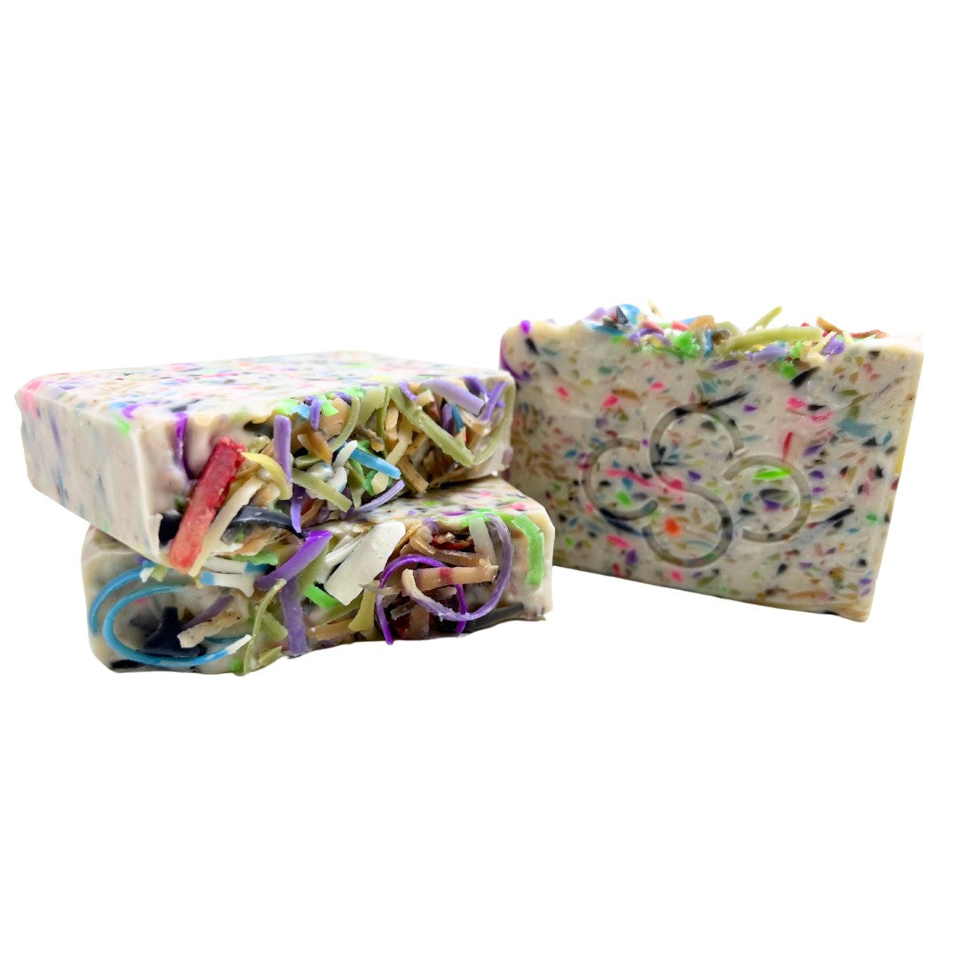 Bring the fun of summer to your daily routine with Beach Party, our colorful, unscented soap designed to brighten your bathroom and your mood. Each bar is handcrafted with cheerful, confetti-like soap pieces and topped with a playful swirl of colorful shavings—no two are exactly alike.