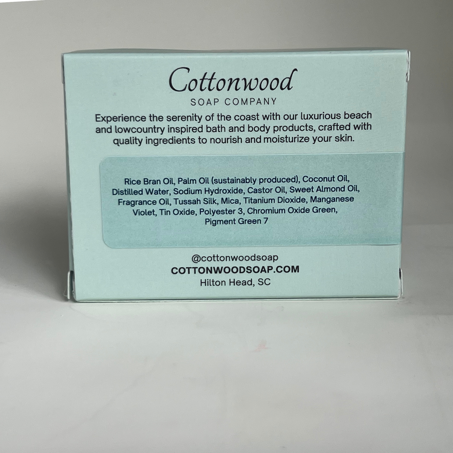 INGREDIENTS: Rice Bran Oil, Palm Oil (sustainably produced), Coconut Oil, Distilled Water, Sodium Hydroxide, Castor Oil, Sweet Almond Oil, Fragrance Oil, Tussah Silk, Mica, Titanium Dioxide, Manganese Violet, Tin Oxide, Polyester 3, Chromium Oxide Green, Pigment Green 7.