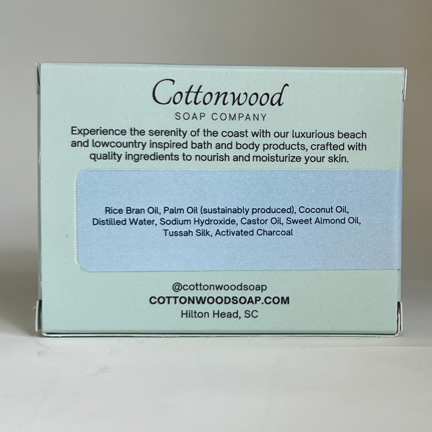 INGREDIENTS: Rice Bran Oil, Palm Oil (sustainably produced), Coconut Oil, Distilled Water, Sodium Hydroxide, Castor Oil, Sweet Almond Oil, Fragrance Oil, Tussah Silk, Activated Charcoal.