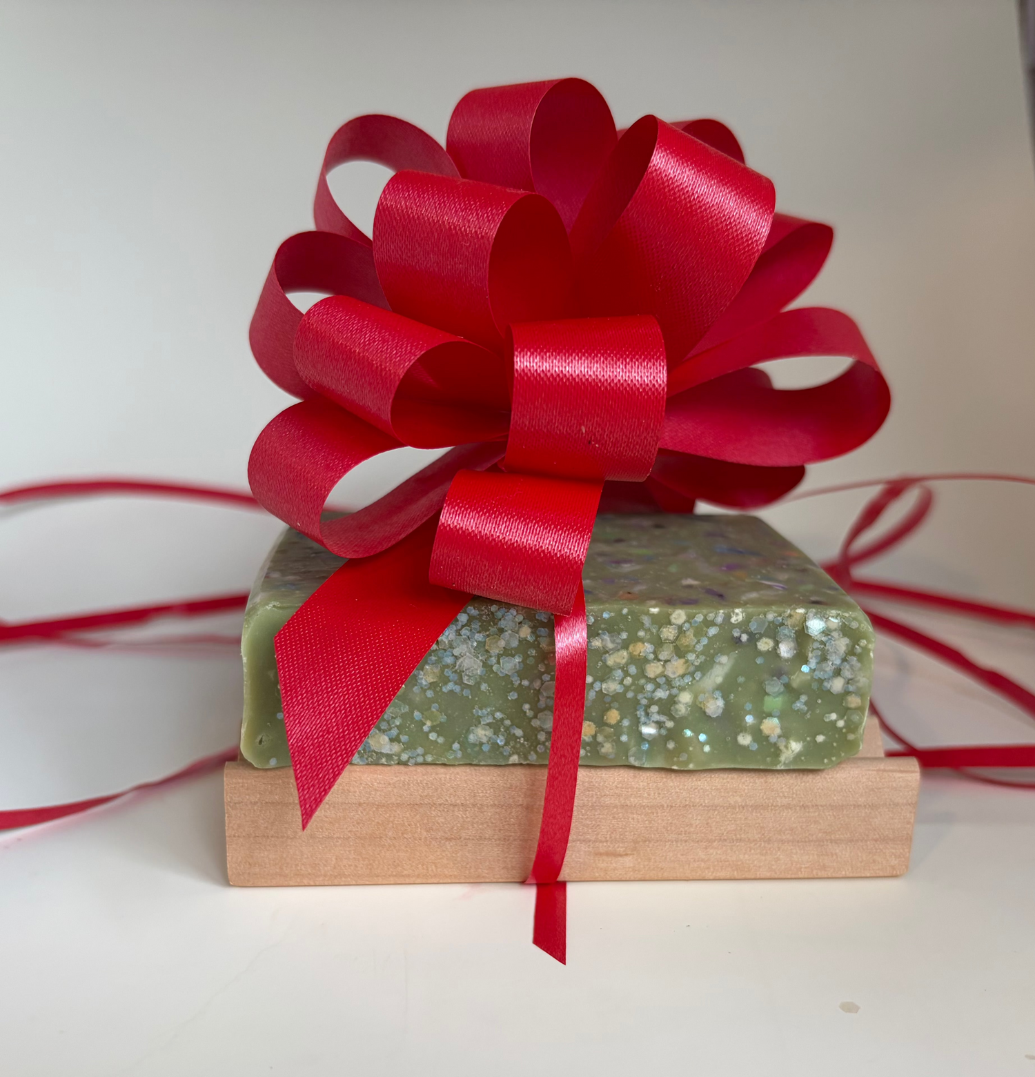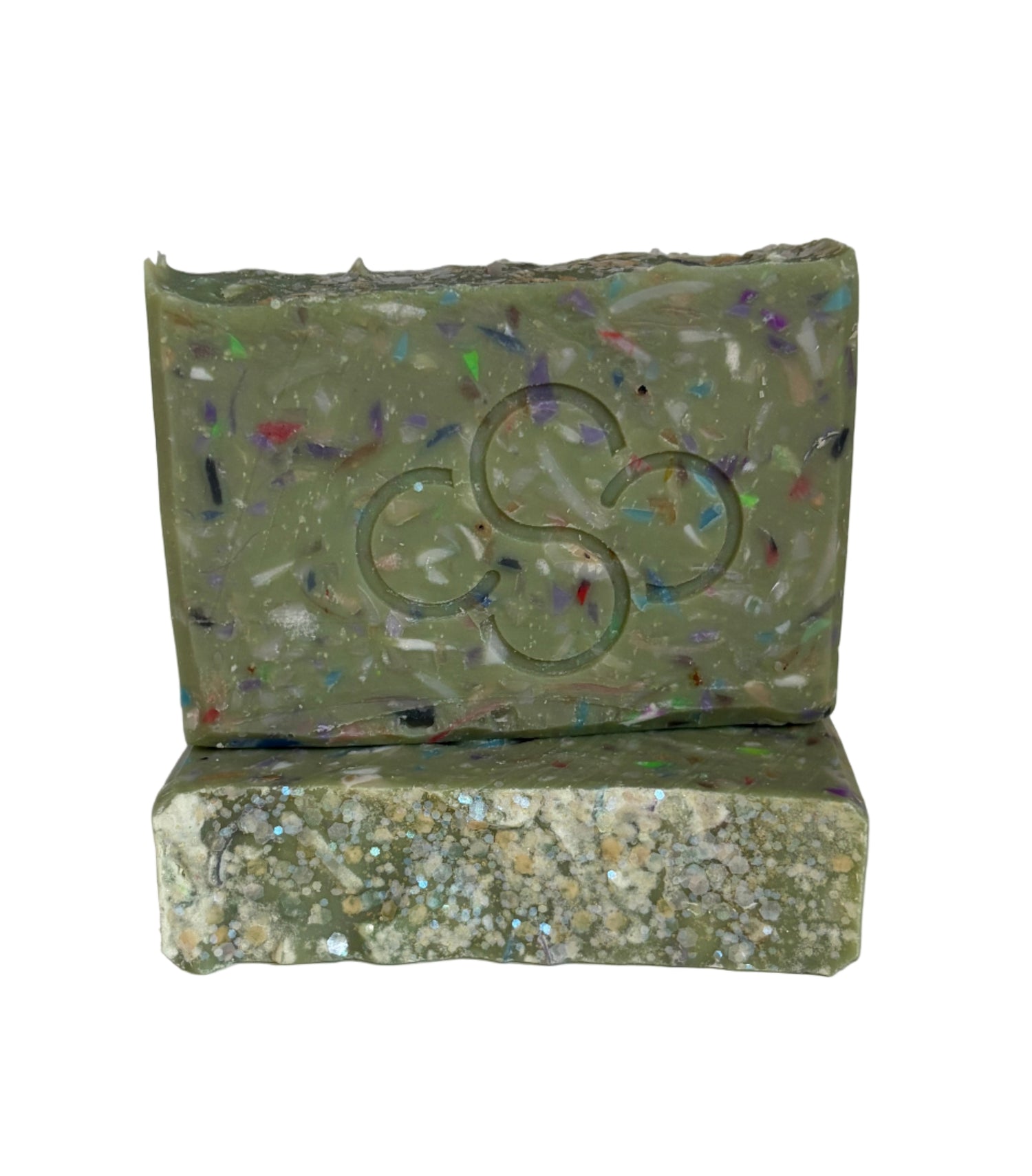 This stunning bar features a rich evergreen base, filled with bright, multi-colored soap confetti—a playful nod to the colorful ornaments that decorate your tree. Each bar is finished with a dusting of snowy, shimmering glitter, reminiscent of twinkling lights glowing on fresh pine branches. It’s a holiday mood in soap form!