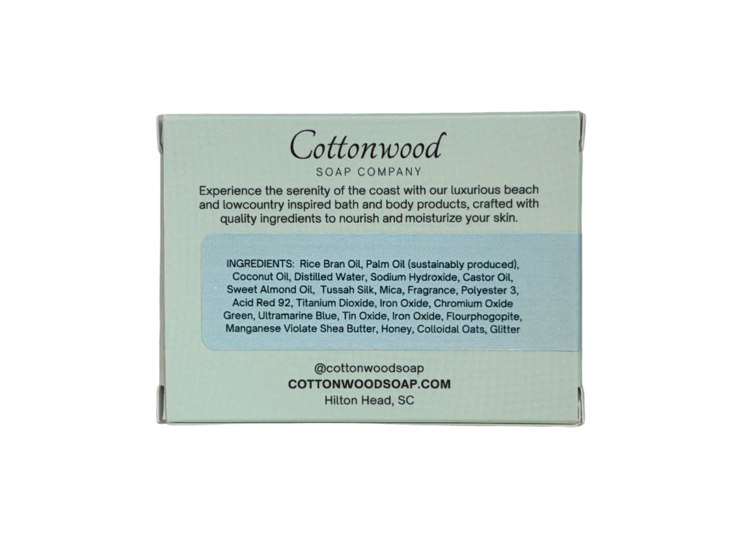 INGREDIENTS: Rice Bran Oil, Palm Oil (sustainably produced), Coconut Oil, Distilled Water, Sodium Hydroxide, Castor Oil, Sweet Almond Oil, Fragrance Oil, Tussah Silk, Mica, Polyester 3, Acid Red 92, Titanium Dioxide, Iron Oxide, Chromium Oxide Green, Ultramarine Blue, Tin Oxide, Iron Oxide, Flourphogopite, Manganese Violet, Shea Butter, Honey, Colloidal Oats, Body Safe Glitter
