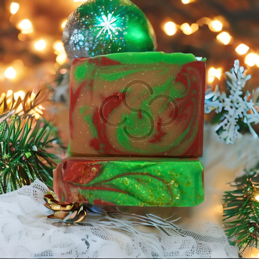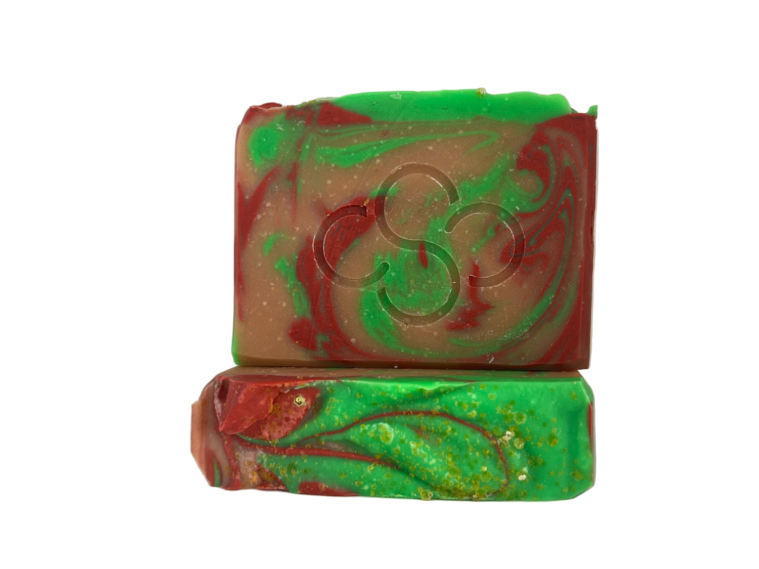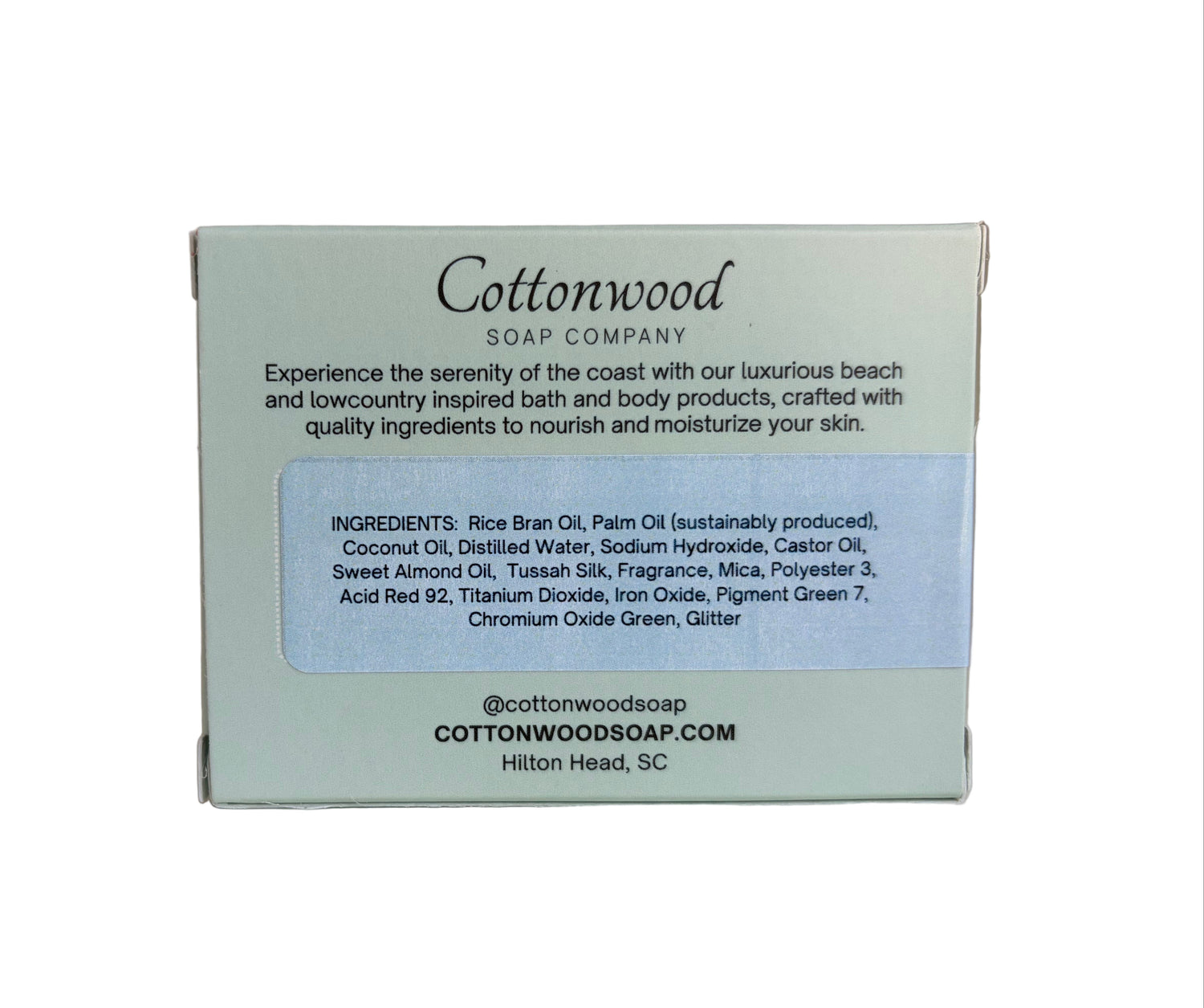 INGREDIENTS: Rice Bran Oil, Palm Oil (sustainably produced), Coconut Oil, Distilled Water, Sodium Hydroxide, Castor Oil, Sweet Almond Oil, Fragrance Oil, Tussah Silk, Mica, Polyester 3, Acid Red 92, Titanium Dioxide, Iron Oxide, Pigment Green 7, Chromium Oxide Green, Body Safe Glitter