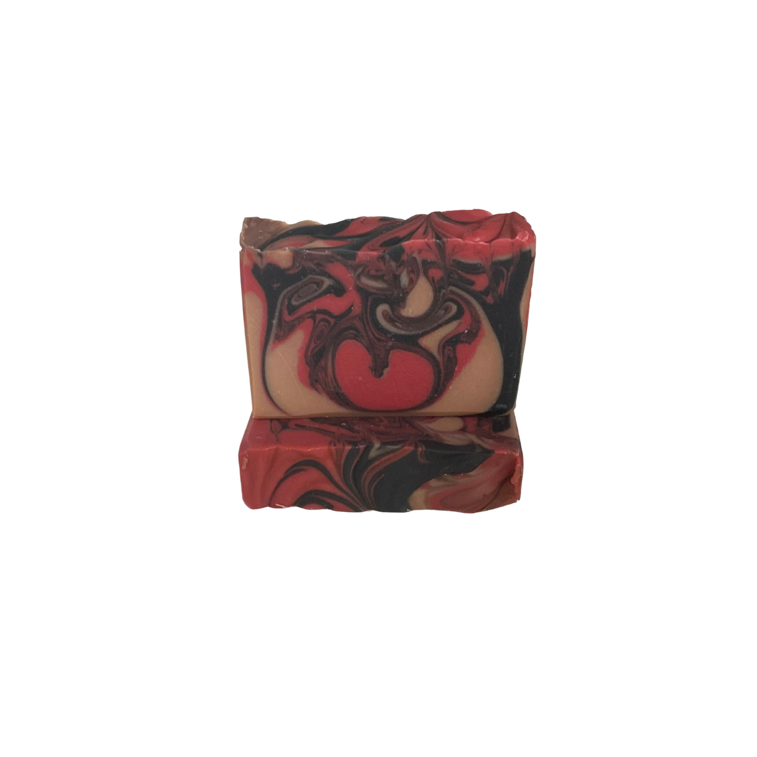 INGREDIENTS: Rice Bran Oil, Palm Oil (sustainably produced), Coconut Oil, Distilled Water, Sodium Hydroxide, Castor Oil, Sweet Almond Oil, Fragrance Oil, Tussah Silk, Activated Charcoal, Mica, Polyester 3, Acid Red 92, Titanium Dioxide, Iron Oxide.